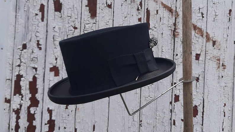 The hat comes with the gorgeous hat pin shown – there are several hat pin style options   – please contact us regarding any queries about this