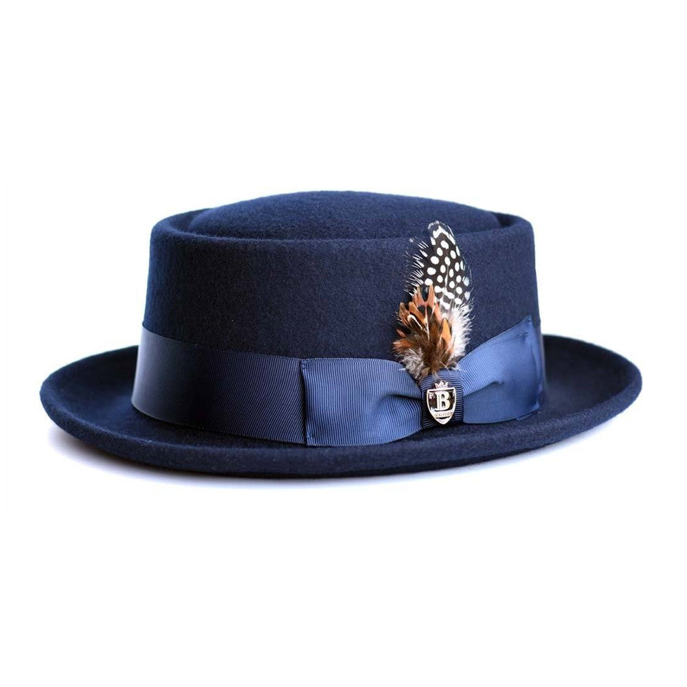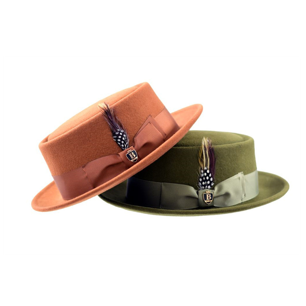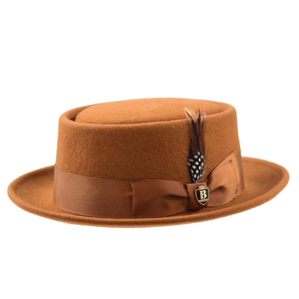 The wool pork pie is made of 100% wool felt, providing a smooth and supple feel. This hat is finished with a grosgrain hat band and decorative feather accent.