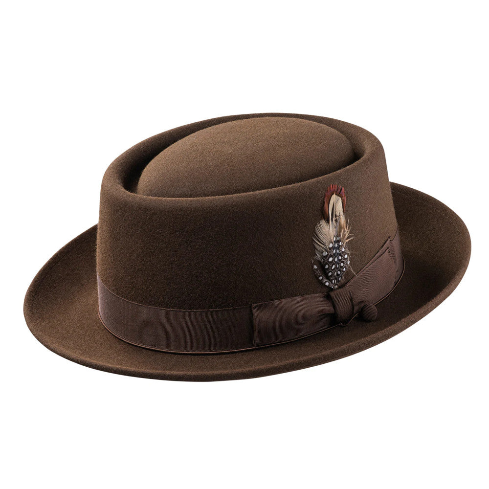 Crafted with a felt finish, the Porkpie Hat was uniquely designed with a round, telescope crown. This high-quality, statement hat features a luxurious felt finish appropriately worn for any occasion.