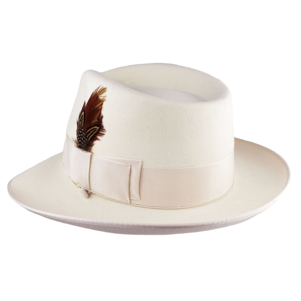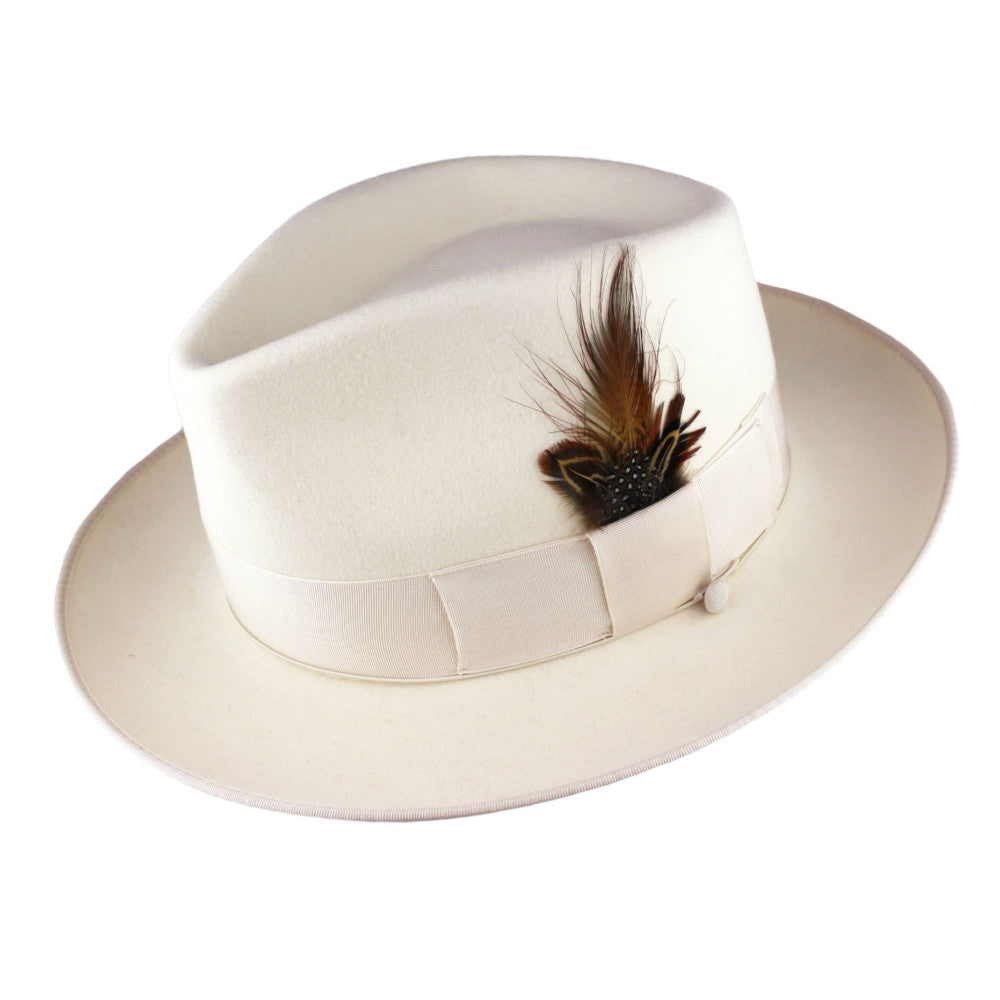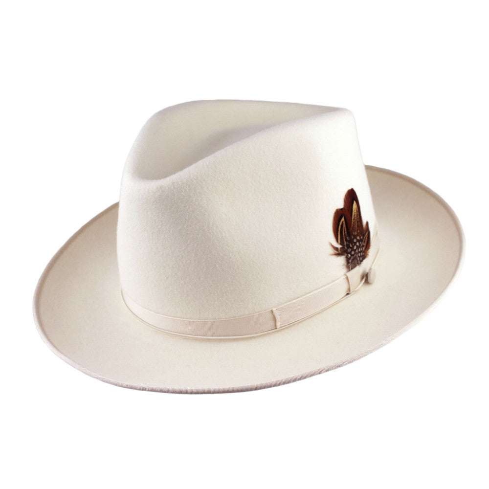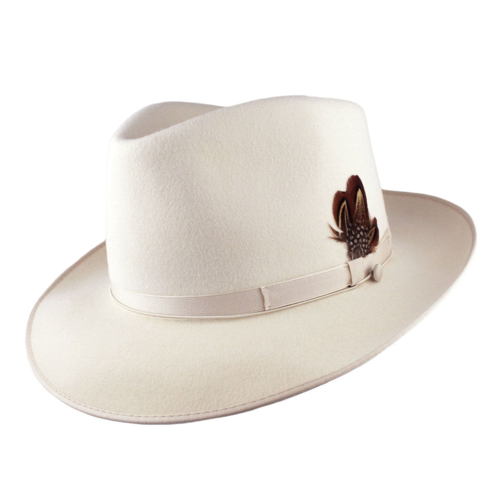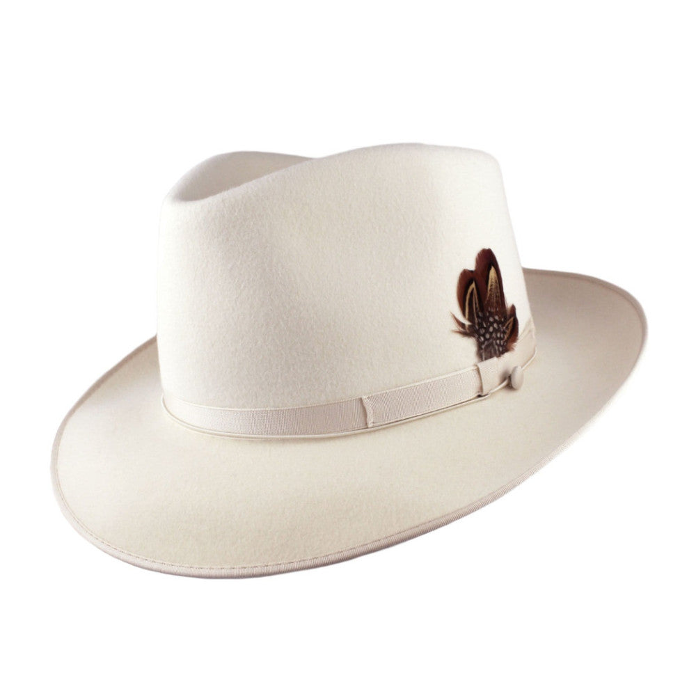 A classic fedora made of genuine fur felt complimented with a sleek grosgrain band and a 2 1/2" brim. Finished with a hand sewn bound edge, and wind-cord for those blustery days. The crown is blocked in the teardrop shape for those seeking a lower profile.100% Fur Felt