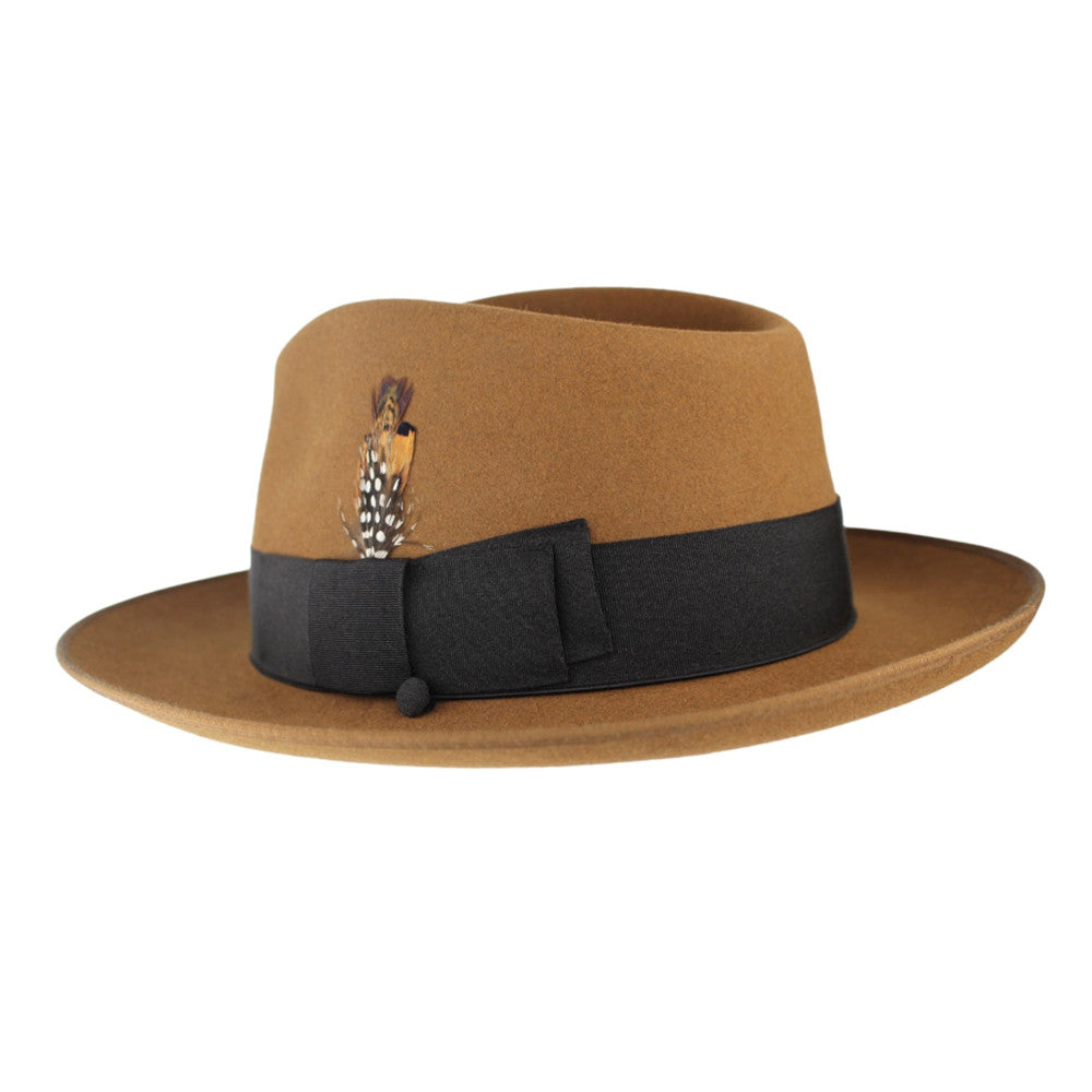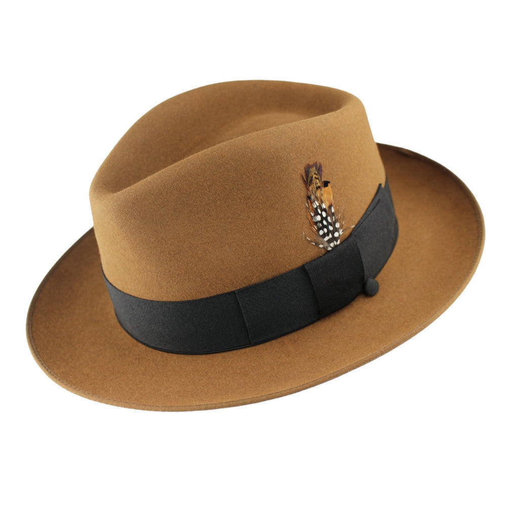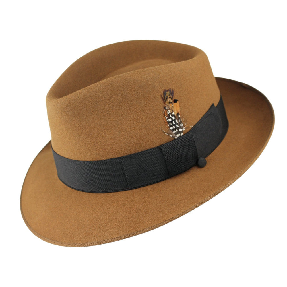 A classic fedora made of genuine fur felt complimented with a sleek grosgrain band and a 2 1/2" brim. Finished with a hand sewn bound edge, and wind-cord for those blustery days. The crown is blocked in the teardrop shape for those seeking a lower profile.100% Fur Felt