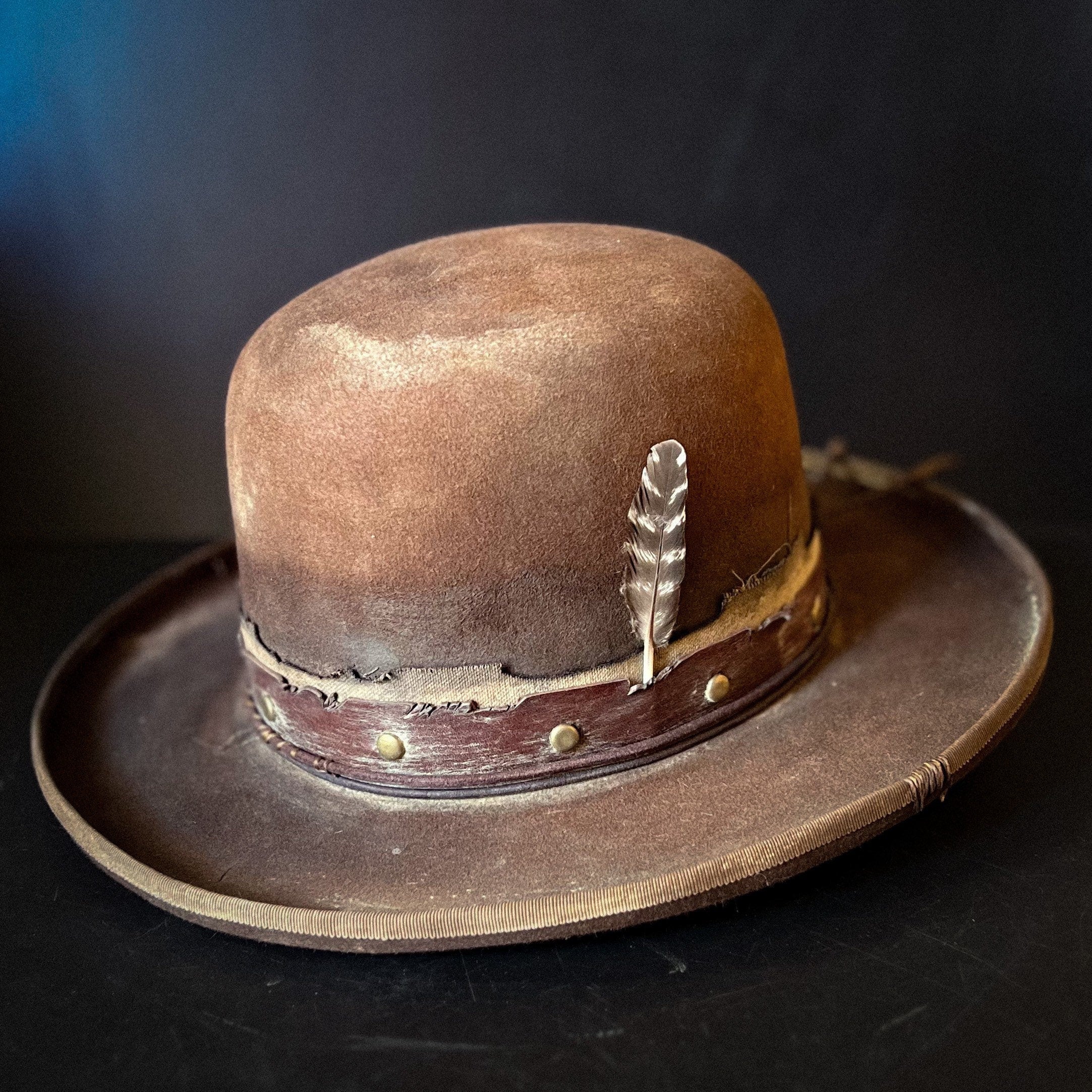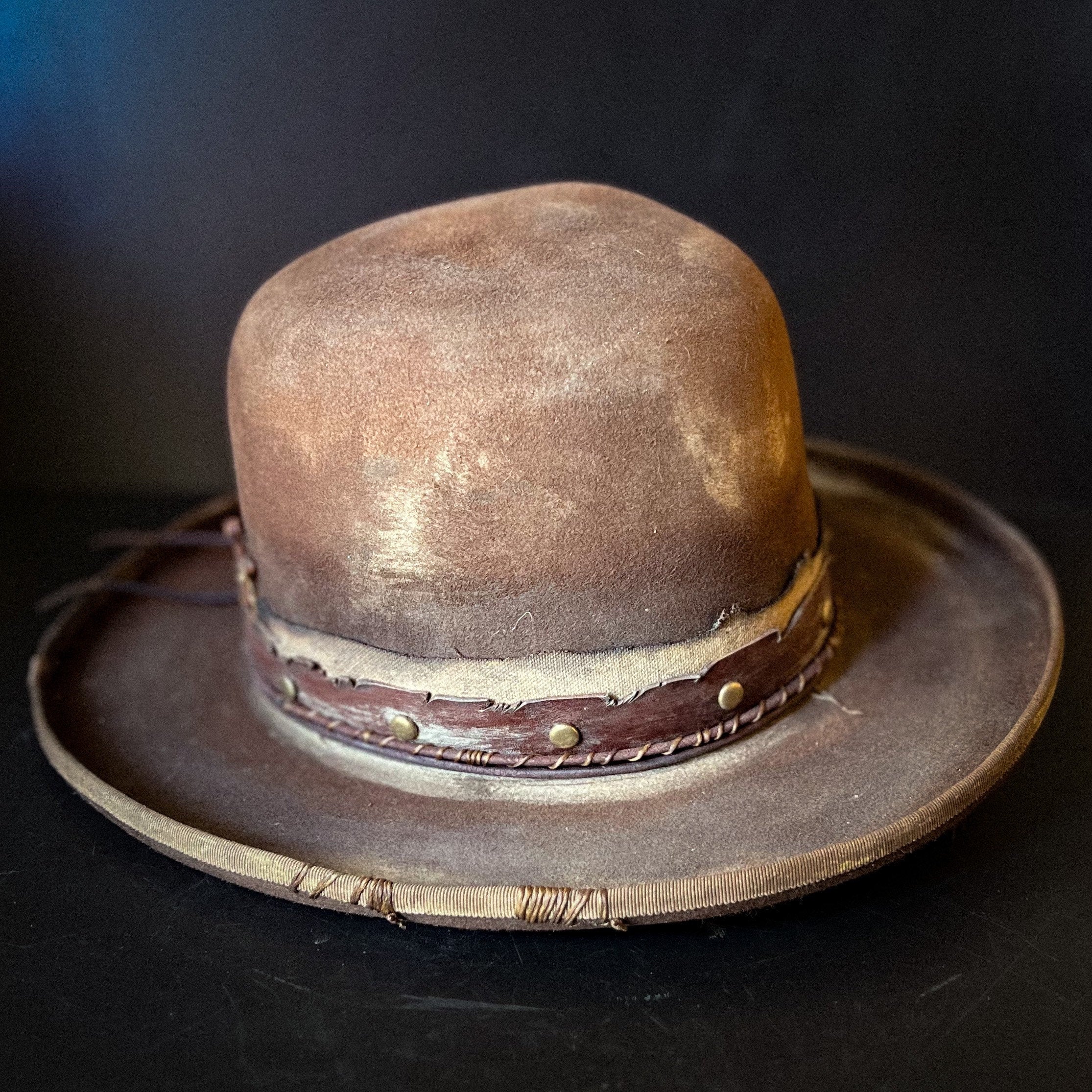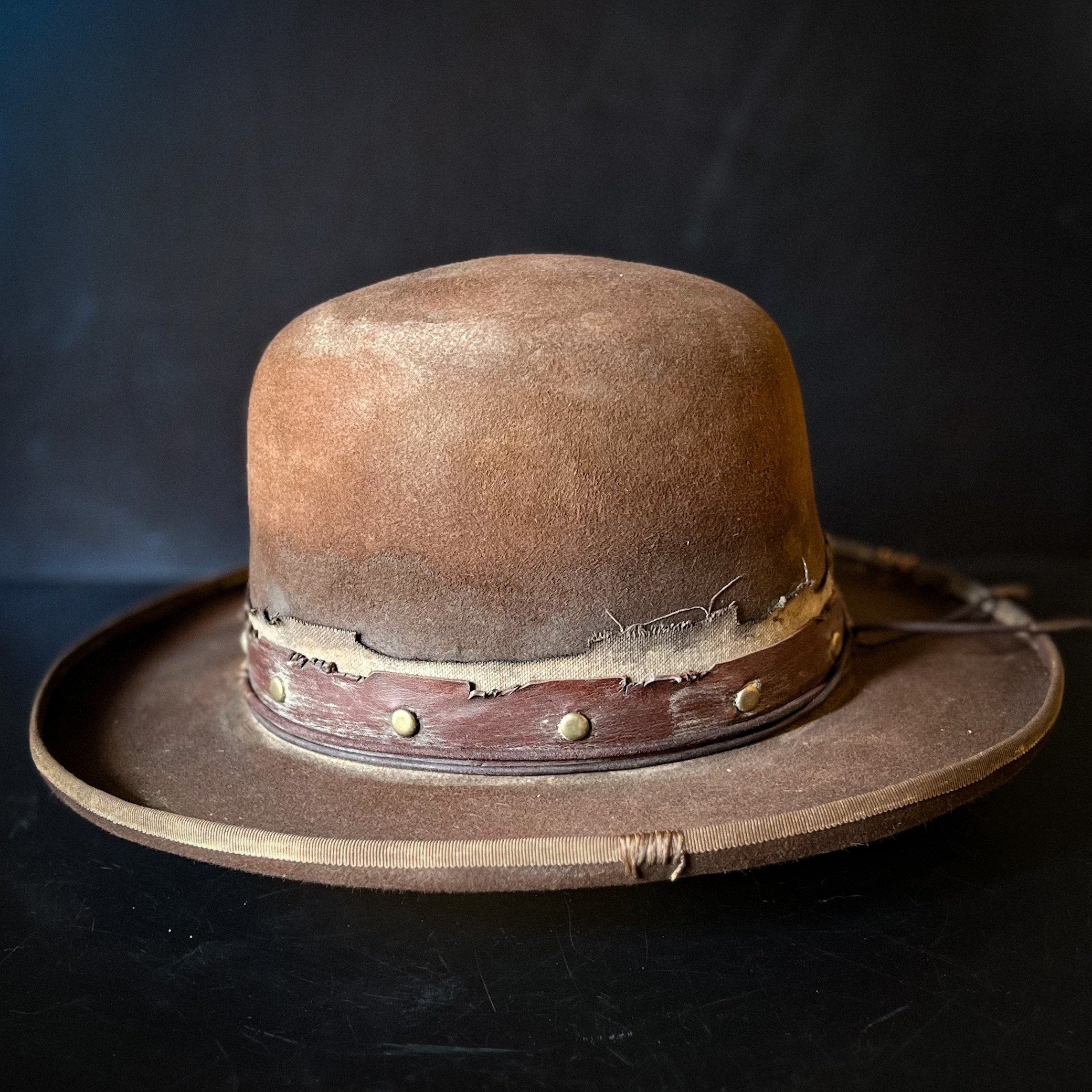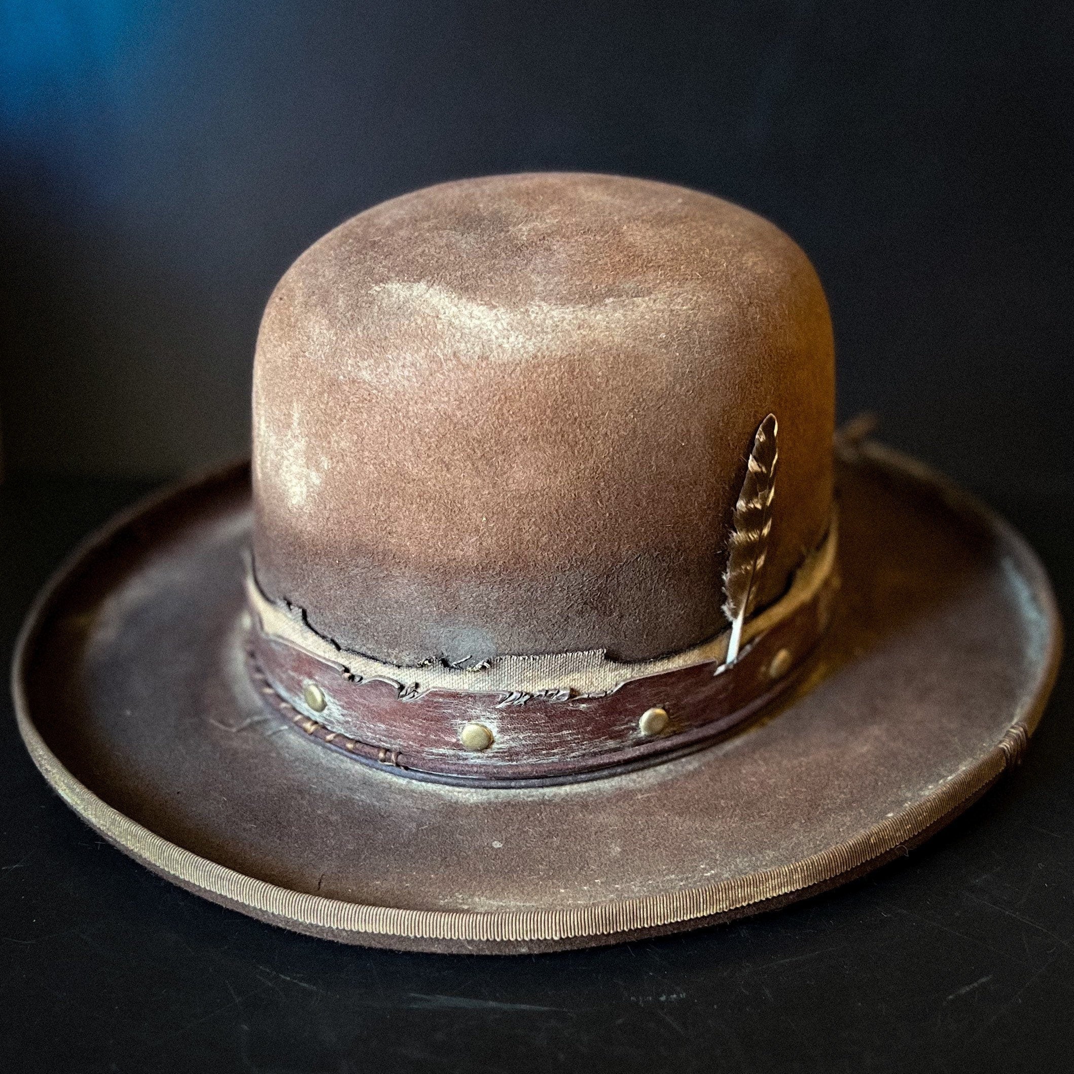 The “Loner” is a 100% Beaver fur, dress weight, distressed cowboy hat. Lighter weight than a Western weight style.Made to look worn, distressed with sweat stains, dust and dirt and gives off a helluva character vibe. Open crown which is totally shape-able if you wanted to put your own crease and or dents in.
