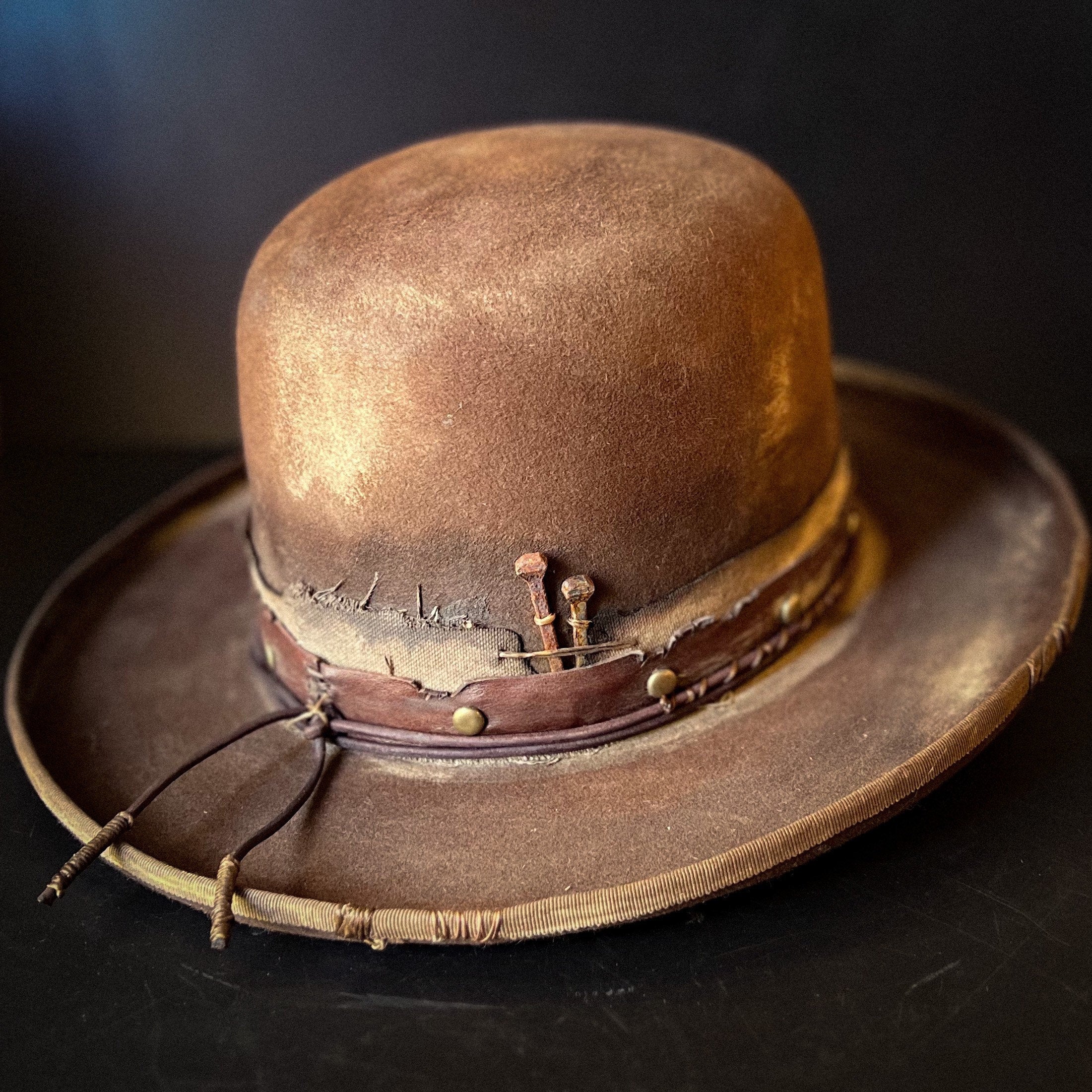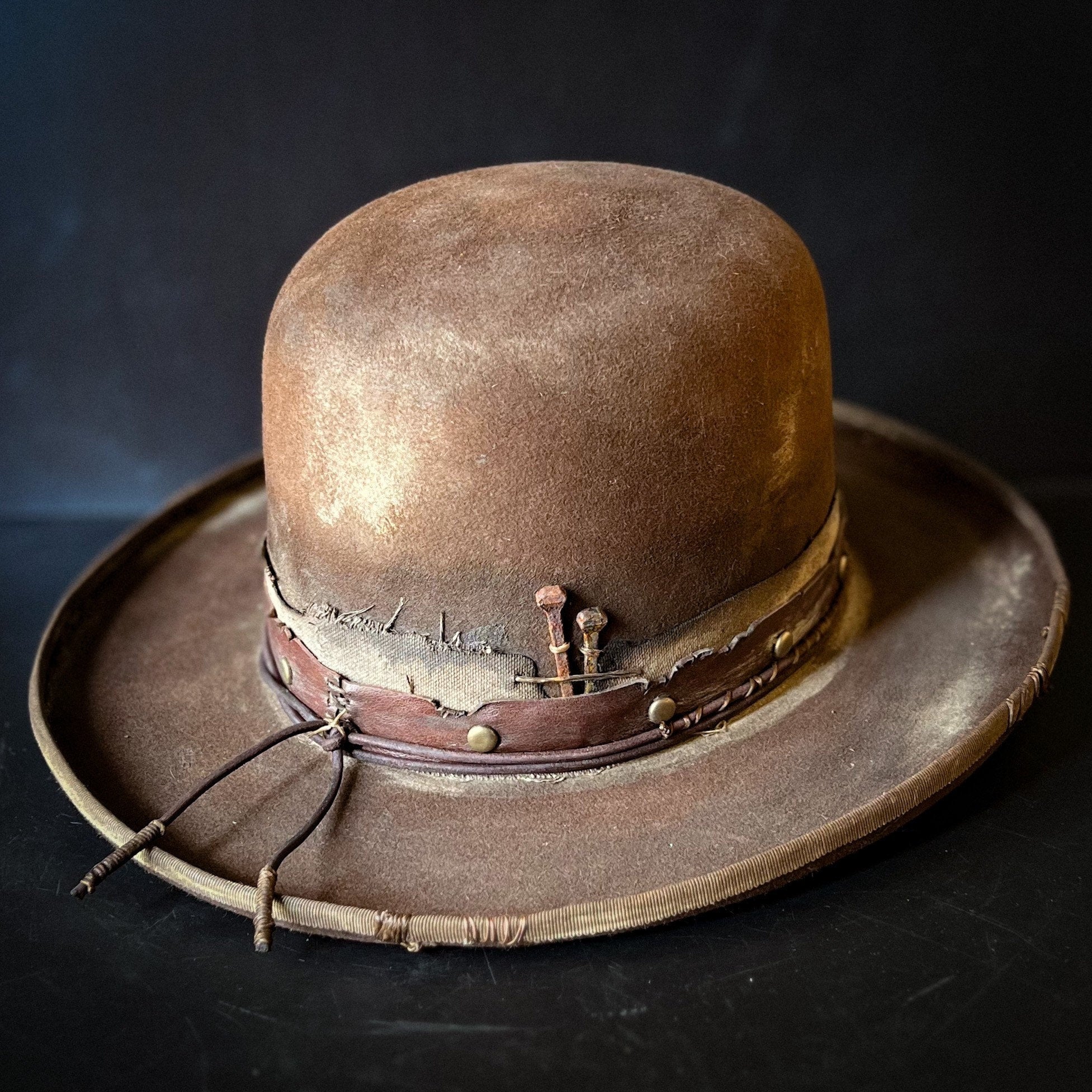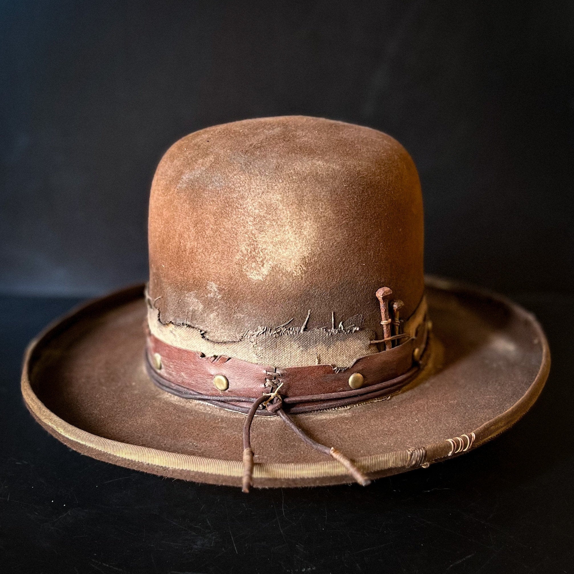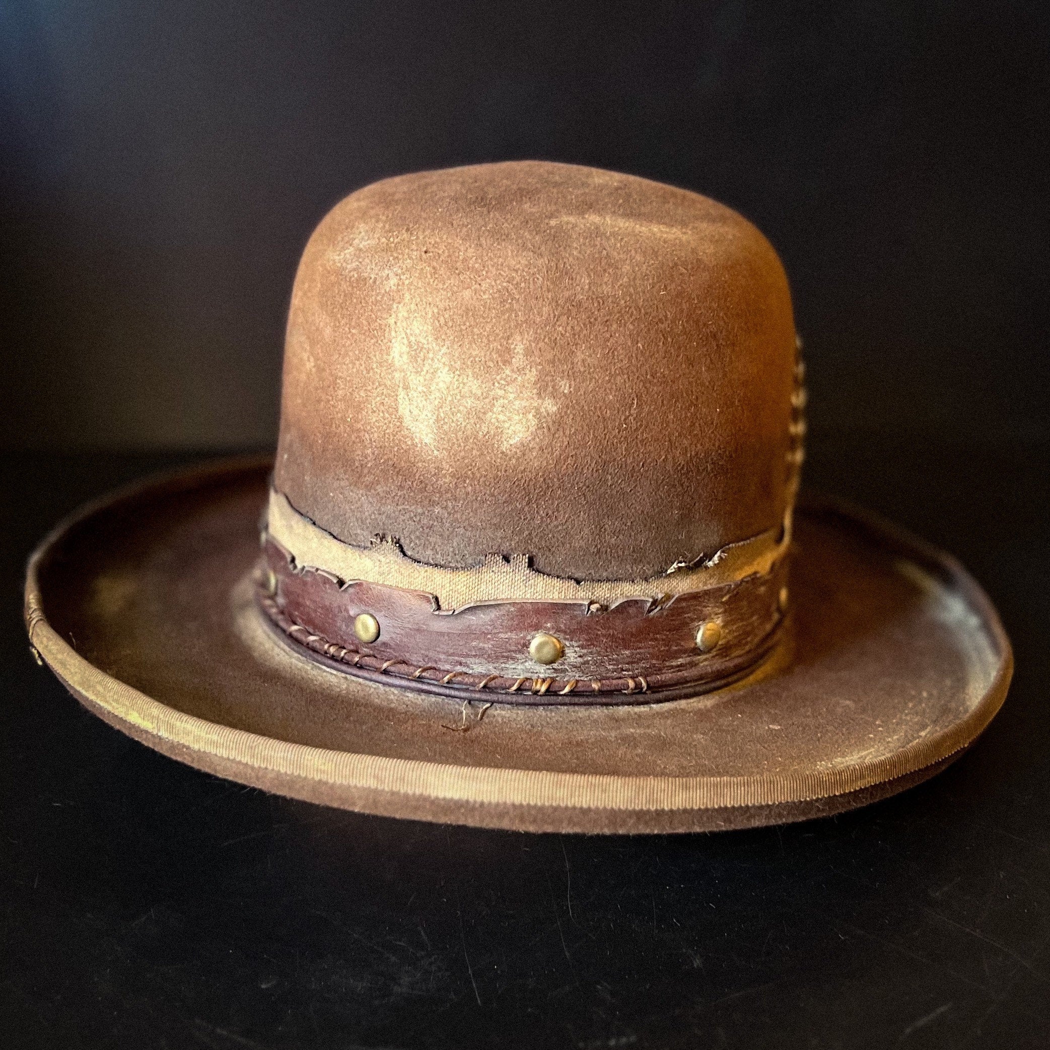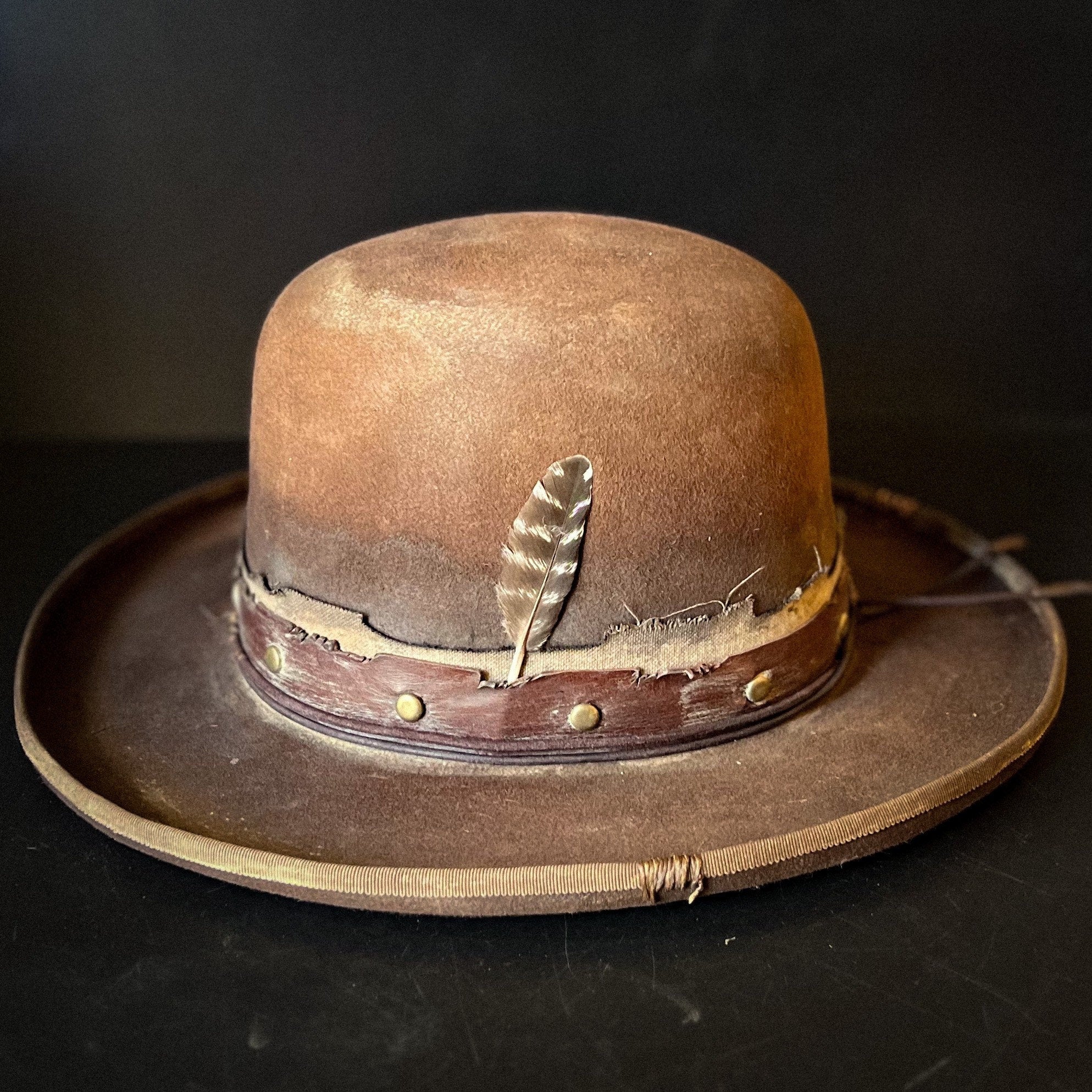 The “Loner” is a 100% Beaver fur, dress weight, distressed cowboy hat. Lighter weight than a Western weight style.Made to look worn, distressed with sweat stains, dust and dirt and gives off a helluva character vibe. Open crown which is totally shape-able if you wanted to put your own crease and or dents in.
