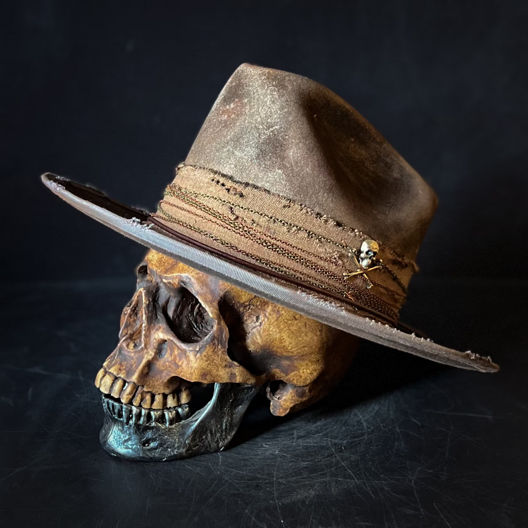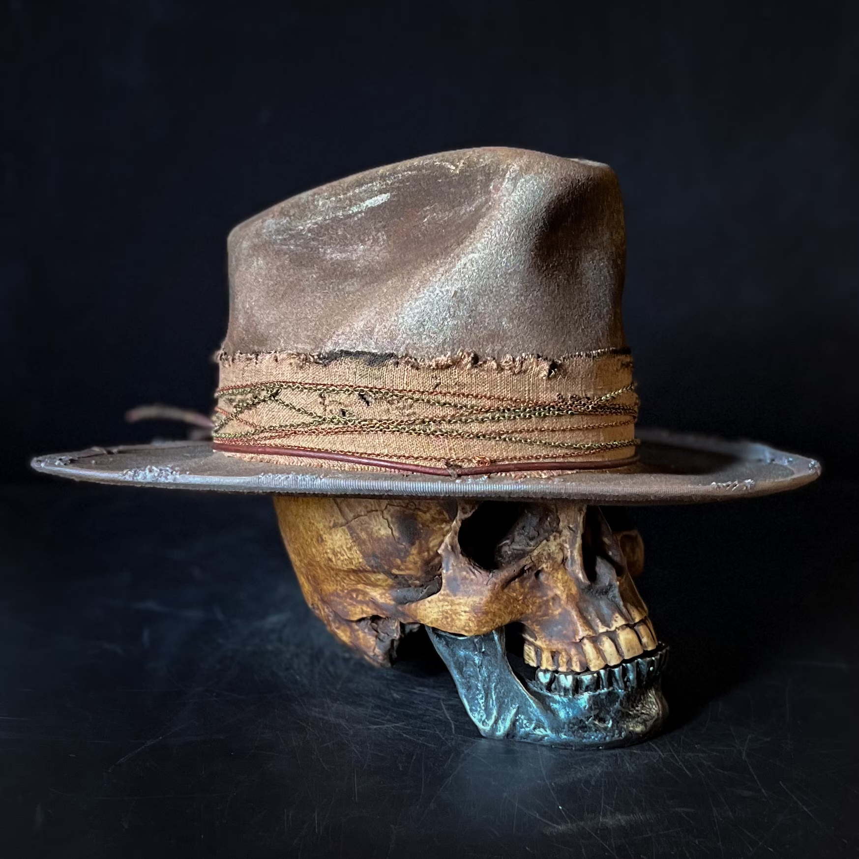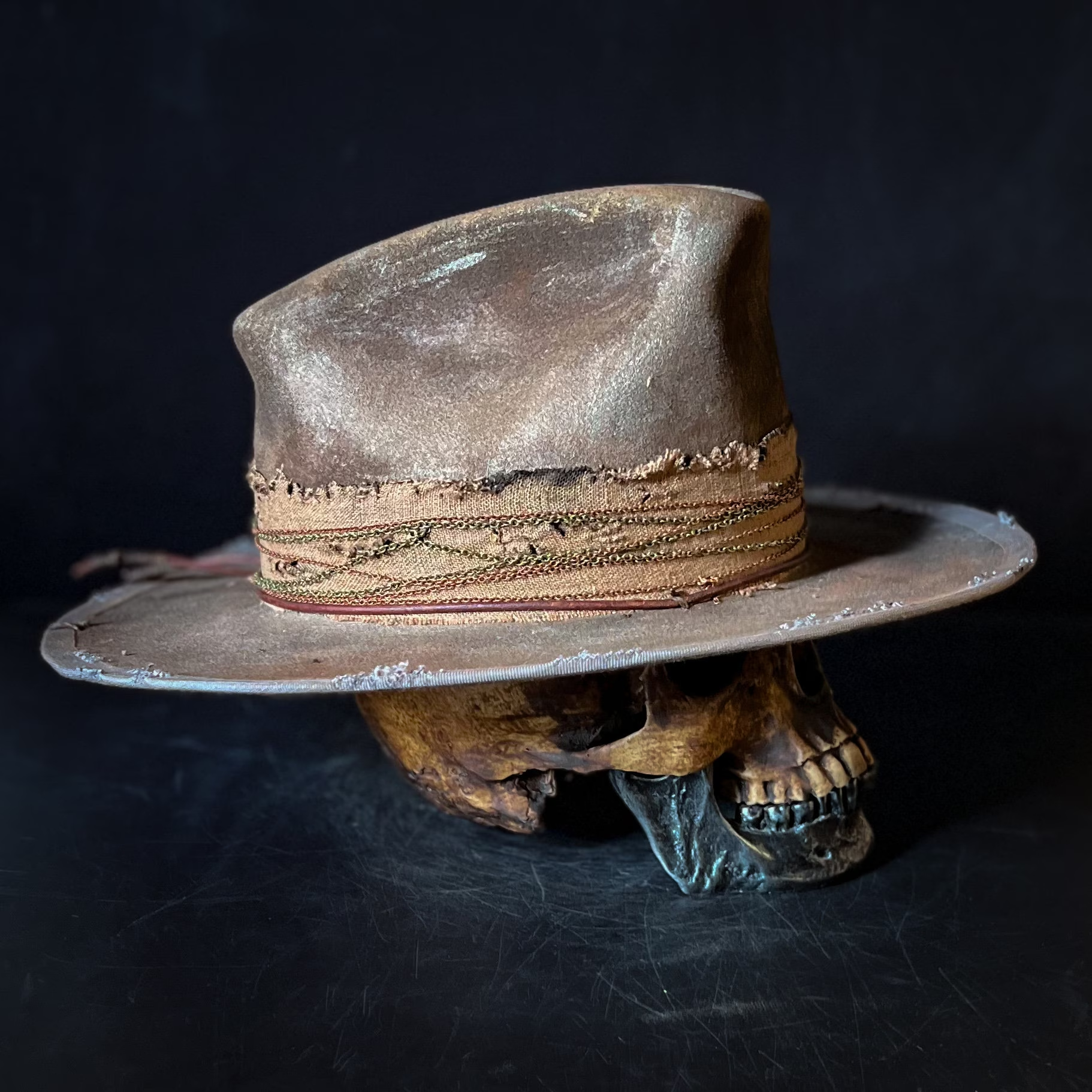 The “Scam Artist” from RockHatter. Distressed fur and banding done how Ugly Outlaw does it! Banding is wrapped with small copper and brass colored decorative chain with a skull and crossbones on the side and leather lace at the base of the crown.