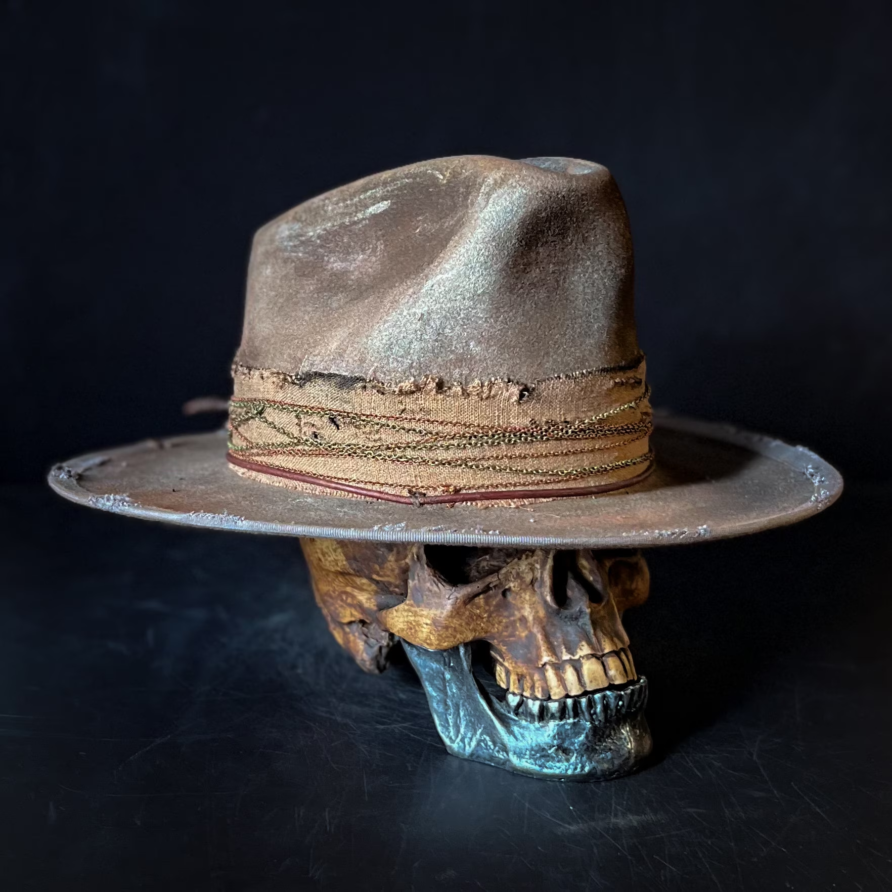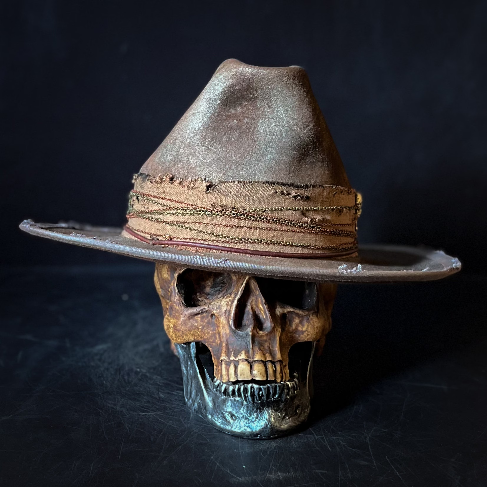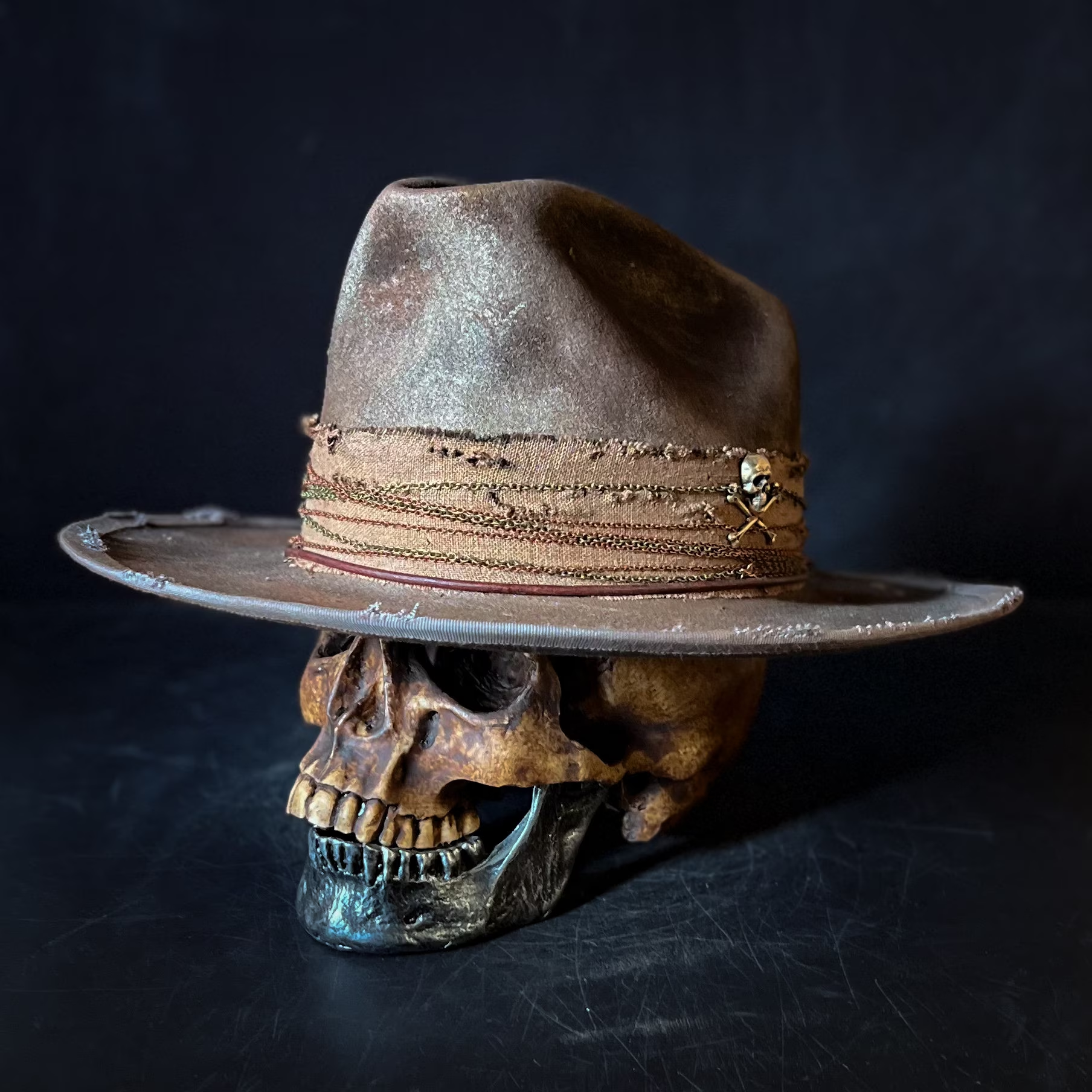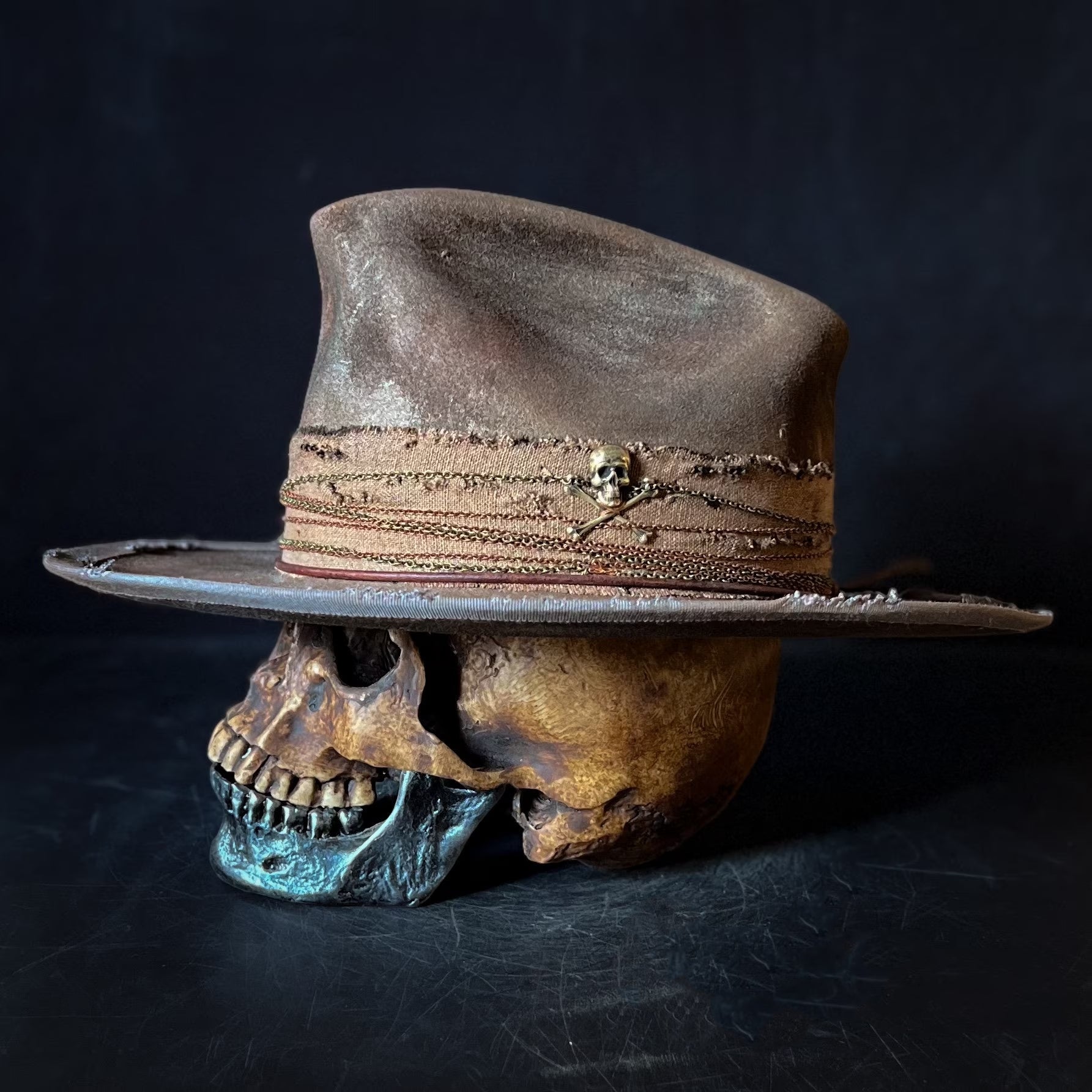 The “Scam Artist” from RockHatter. Distressed fur and banding done how Ugly Outlaw does it! Banding is wrapped with small copper and brass colored decorative chain with a skull and crossbones on the side and leather lace at the base of the crown.