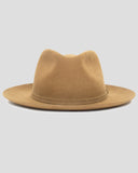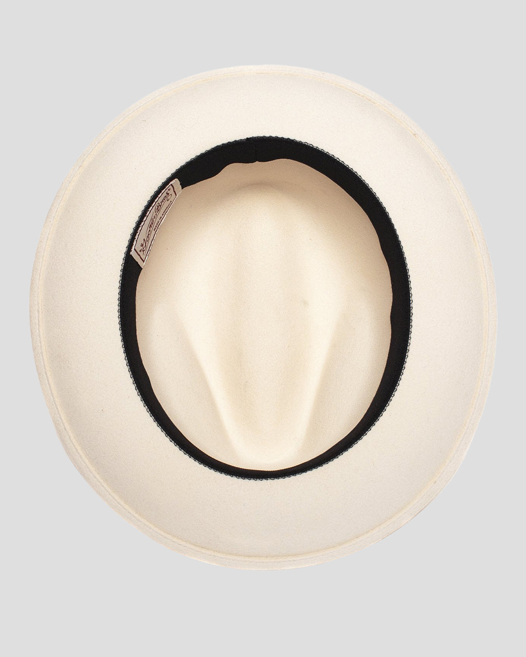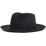 Night Hawk is a shallow depth teardrop crown fedora built on [BLOCK No.18] with a wide snap brim, medium stiffness, and a smooth finish. This all season hat features a 4” teardrop crown, 2 3/4” raw edge snap brim, a self-felt hat band with a genuine leather sweatband.