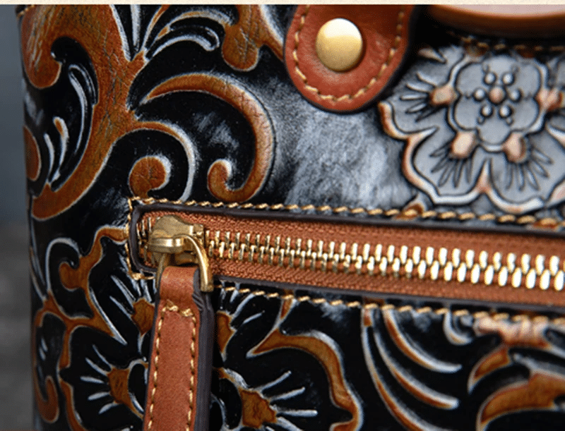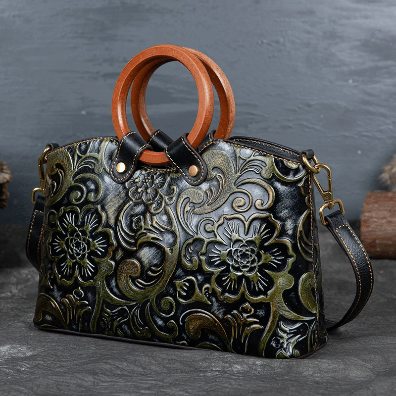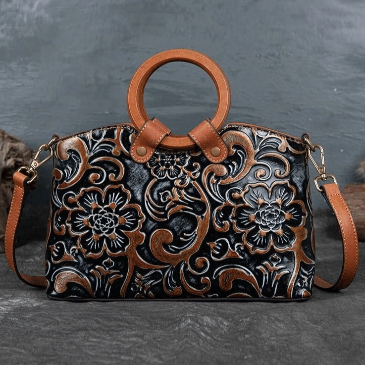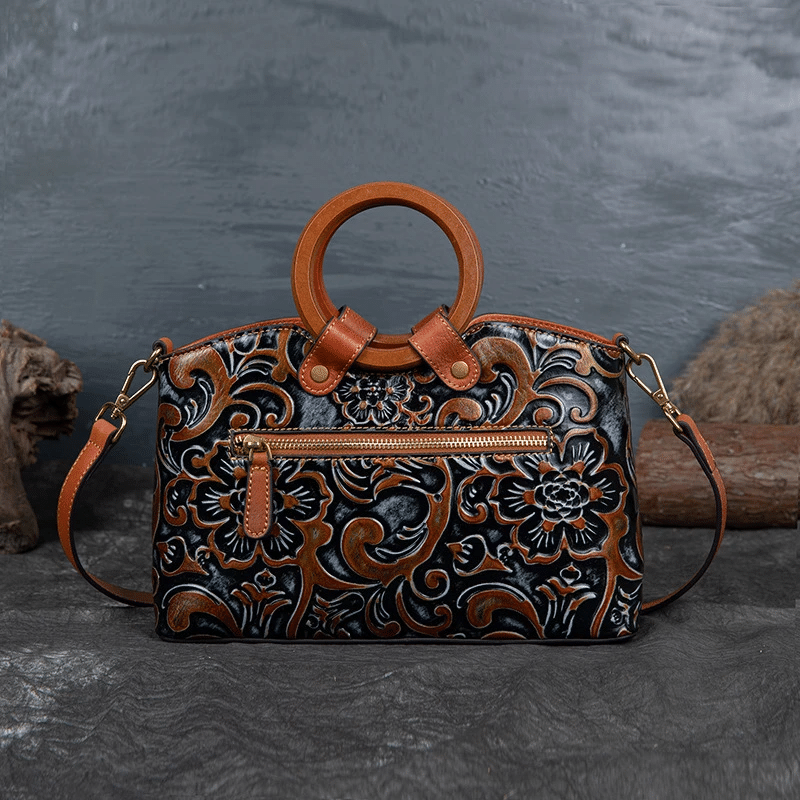 Take your taste for luxury to the streets with this Genuine Leather Vintage Embossed Handbag. An all-around vintage embossed design on genuine cowhide leather and a unique round wooden handle make this purse an extraordinary option to fashion.
